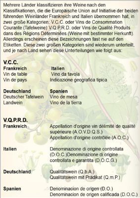 Der Vin de Table wird wie der Vin de Pays in der Kategorie V.C.C. (Vin de Consommation Courante) klassifiziert. Die Weine der beiden letzteren Kategorien werden dagegen in der Kategorie V.Q.P.R.D. (Vin de Qualité produit dans une Région déterminée) eingeordnet.